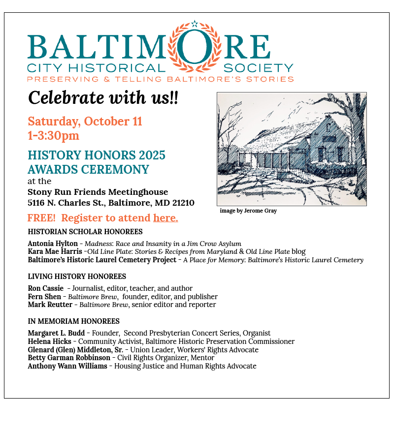 Join us as we celebrate eleven individuals who have made significant contributions to the preservation and understanding of Baltimore's history. The award categories include Historian/Scholar, Living History, and In Memoriam.